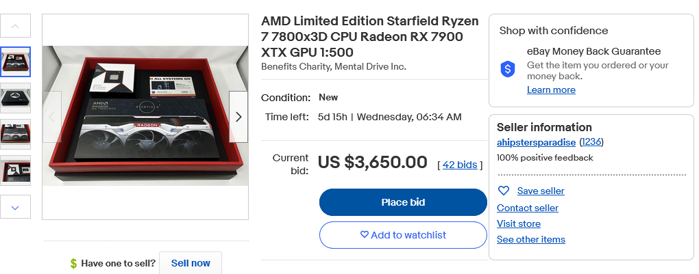 这些 PC 零件包全球仅生产了 500 份,以纪念《星空》发售。不过它们几乎全部都分发给了竞赛获胜者。因为物以稀为贵,捆绑包价格比正常零件要高很多。截至写稿时,当前的拍卖价格已飙升至 3650 美元。目前在欧美,RX7900 XTX 均价为 960 美元(促销价格更低),而 7800X3D 售价约为 400 美元。