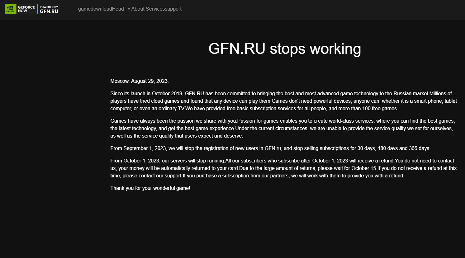 2023年10月1日起,GeForce Now服务将在俄罗斯终止运营,订阅期限未结束的会在半个月内自动予以退款。