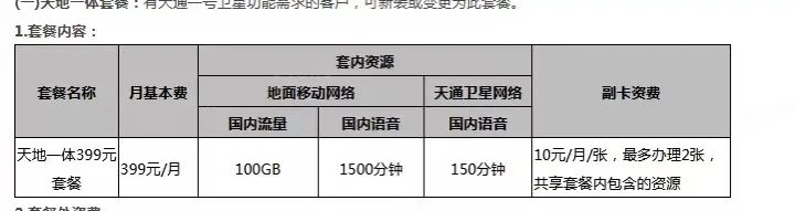 其次你需要打电话联系营业厅,表示要开通售价 399 元的天地一体套餐,里面包含 100GB 的 4G/5G 流量、1500 分钟的 4G/5G 通话时长,以及 150 分钟的卫星通话时长。