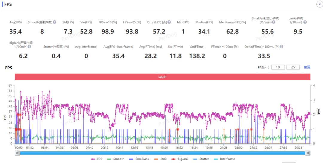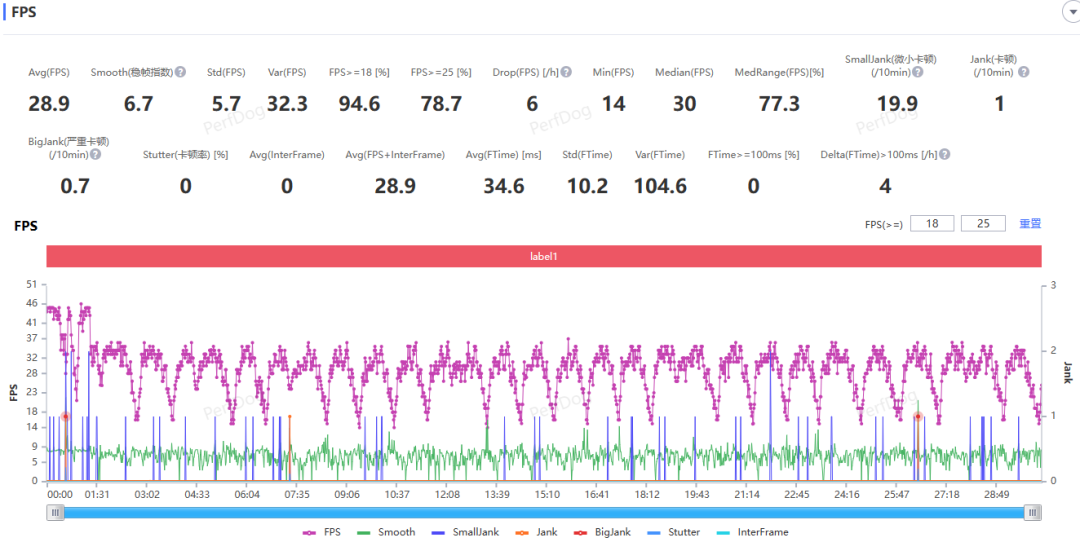 我们直接上 “ 崩铁 ” 跑图数据,30 分钟全高画质星槎海中枢平均帧数 28.9 帧。