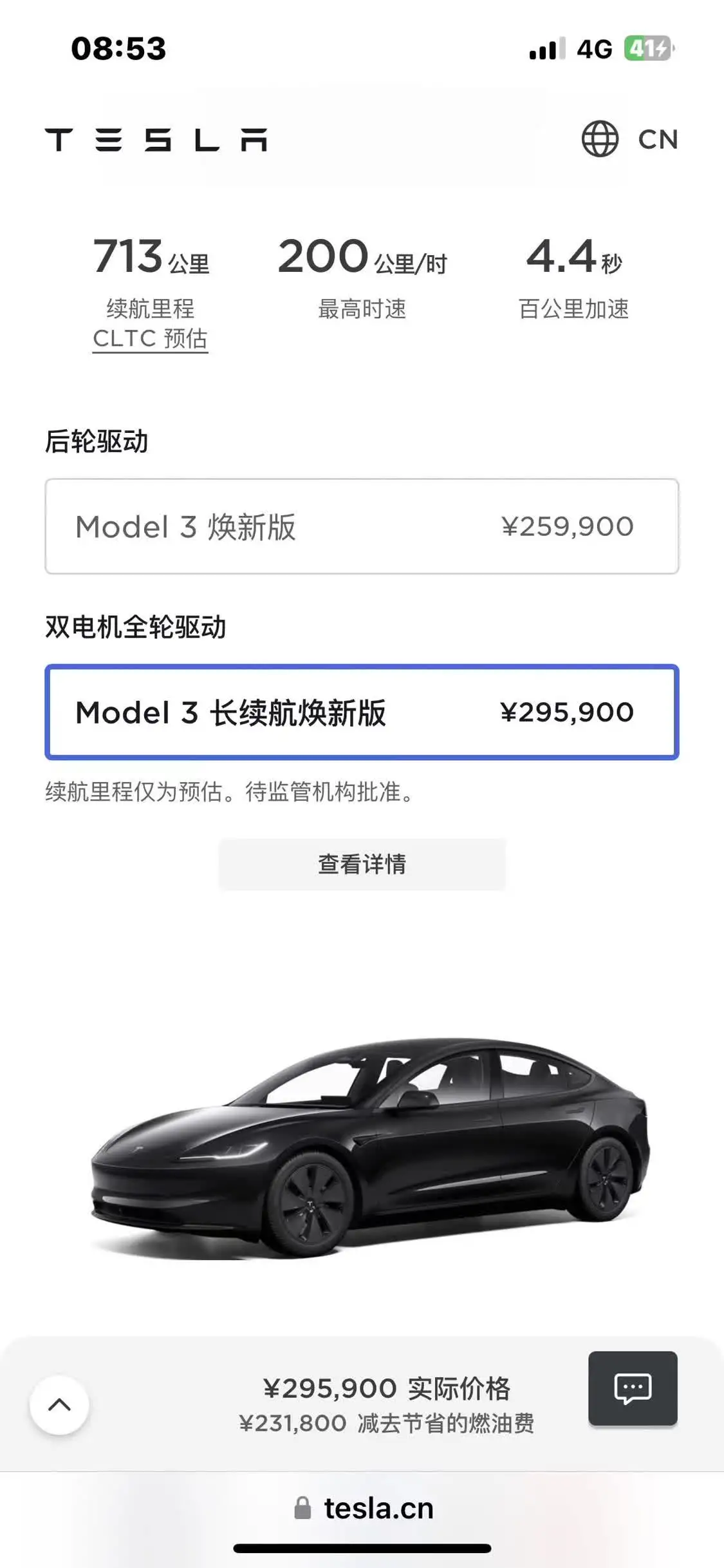 性能方面,新款Model 3 CLTC续航713公里,车身风阻系数0.22,并采用了全新调教的悬架系统和新一代车身稳定系统。