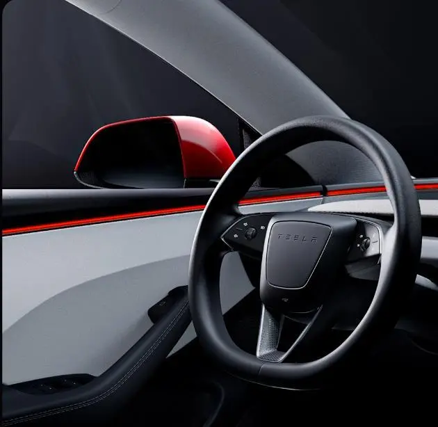新Model 3内部采用智能联动前后双屏,前排座椅通风,值得一提的是新增多色氛围灯,并提供了升级版多功能方向盘。