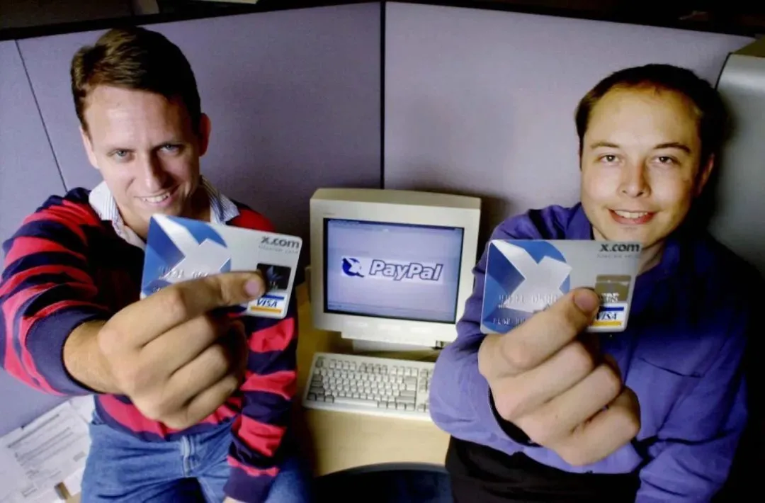 Elon·Musk(右)和 Peter Thiel 的公司于 2000 年 10 月合并成立了 PayPal。