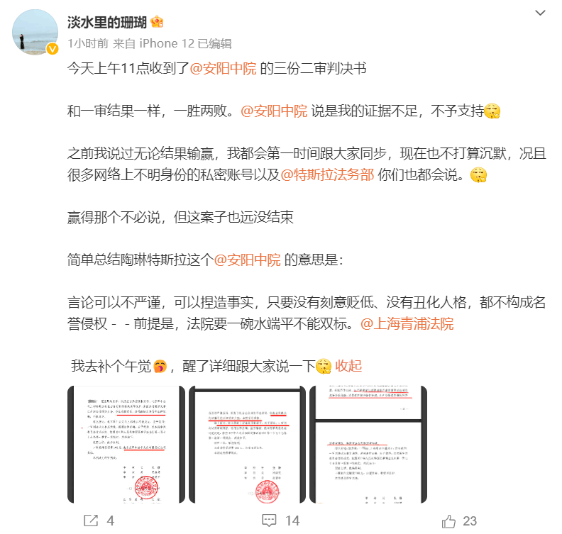 此前闹得沸沸扬扬的“车顶维权女车主起诉特斯拉侵犯名誉权”一事,迎来了最终解决。维权女车主今日发文称:今天收到了法院的二审判决书,和一审结果一样,一胜两败,法院称其证据不足,不予支持,判决为终审判决。