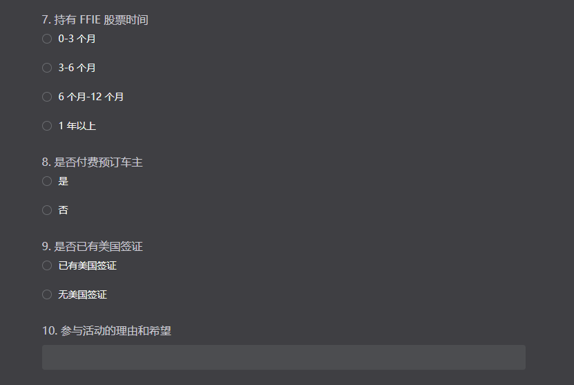 根据报名申请要求,想要参与此次活动,需填写持有FF股票数量、持股时间、是否为付费预订车主等信息。