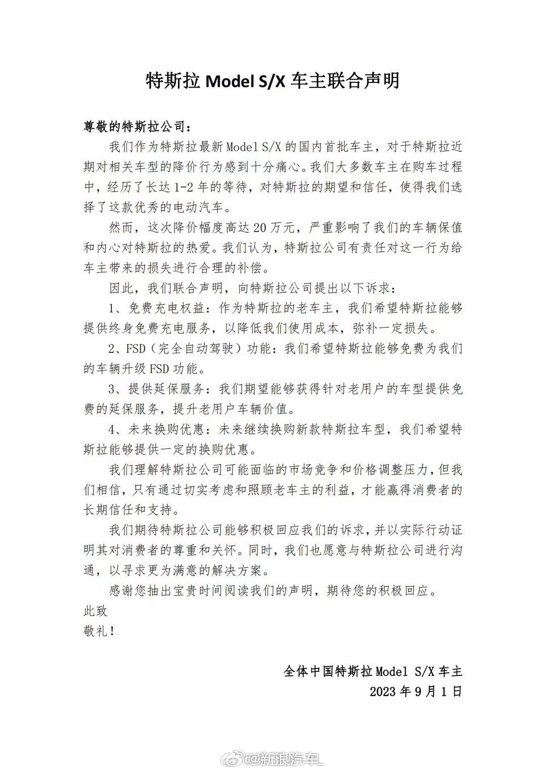 保留节目又来了!就在今日,新款特斯拉Model 3开售,与此同时,特斯拉还公布了另外一个炸裂的消息:Model S和X官宣降价,最大降幅20万元!如果说国产车新款上市降价增配是背刺老车主,特斯拉这直接是“刮骨”了吧,果然,已经花大价钱买车的老车主们坐不住了,火速发布了联合声明,并提出了四点诉求,以下为原文: