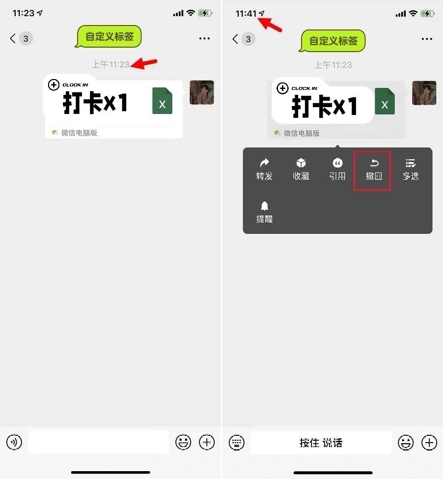 撤回之后,对方也会看到相关提醒,提示撤回的是一条消息,没有显示文件字样,也不会显示撤回时间。