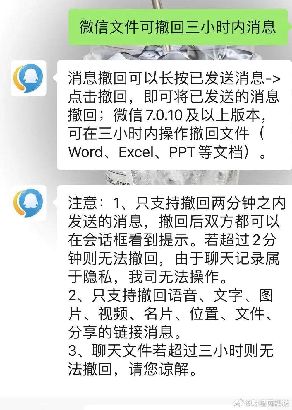 今天微信可撤回三小时之内的消息突然冲上热搜,引起了不少关注。起因是一网友爆料称,三小时之内的Word、Excel、PPT、PDF等文档类消息均可撤回,但需微信更新到7.0.10及以上版本。对此,腾讯客服表示确认:微信7.0.10及以上版本可在三小时内操作撤回文件,超时则无法撤回。