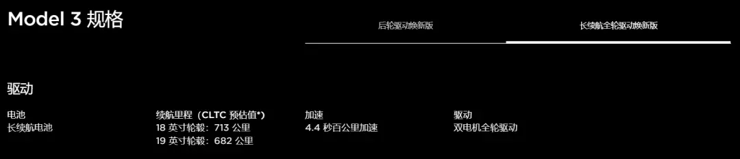 在车型配置上,高性能的 Model 3 Performance 暂时缺席,取而代之的是双电机长续航版回归,和单电机标准续航版形成中、低搭配。