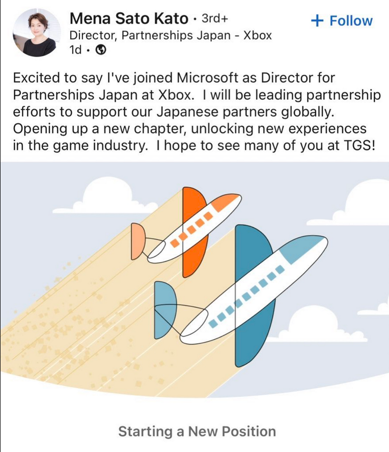 在领英上 Mena Sato 写道:“我很高兴地宣布,我已加入微软,担任 Xbox 日本合作伙伴总监。我将领导合作伙伴努力,在全球范围内支持我们的日本合作伙伴。开启新的篇章,解锁游戏行业的新体验。”