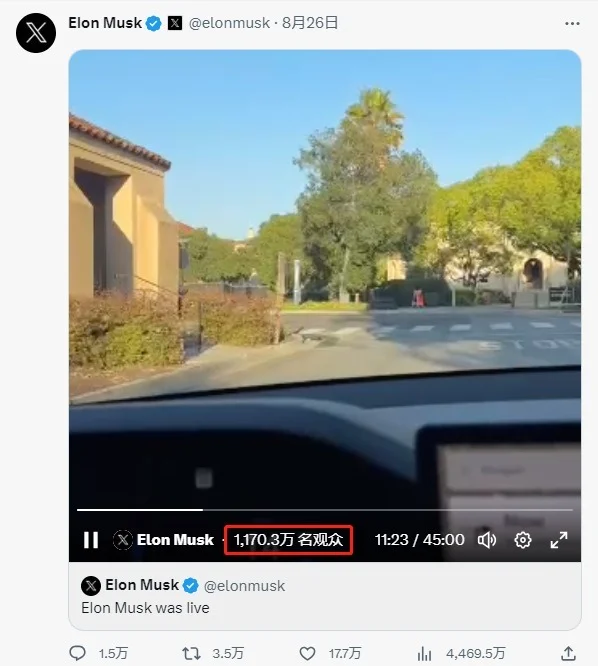 马斯克此次驾驶的是Model S,硬件是基于HW3(Hardware 3)的版本,但软件是新版FSD Beta V12。单手开启Model S后,马斯克举着手机录下了完整行程。整个自动驾驶行程持续了45分钟,直播视频在X平台上吸引了近1200万次观看。