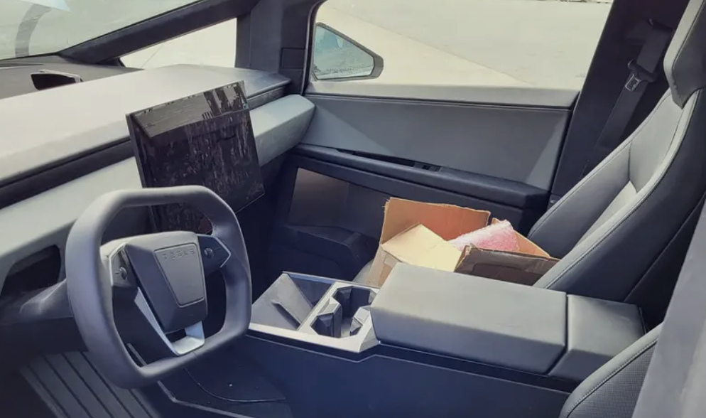 除了车外,内饰照片也被曝光,从图中可以看到,新车采用了全新样式的方形方向盘设计,并未看到大灯、雨刷以及怀挡的身影。所以,全新的Cybertruck将会搭载新款Model 3同样的设计。