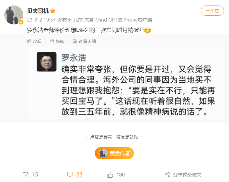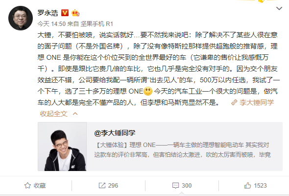 可以看出,作为曾经的理想ONE车主,罗永浩现在仍对理想汽车颇有好感,而“理想汽车500万内最好”,也是罗永浩最先提出的观点。