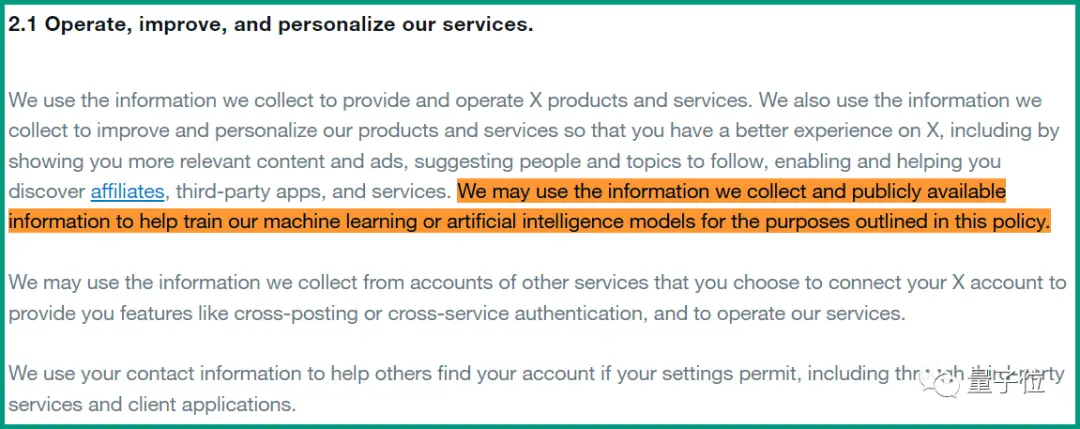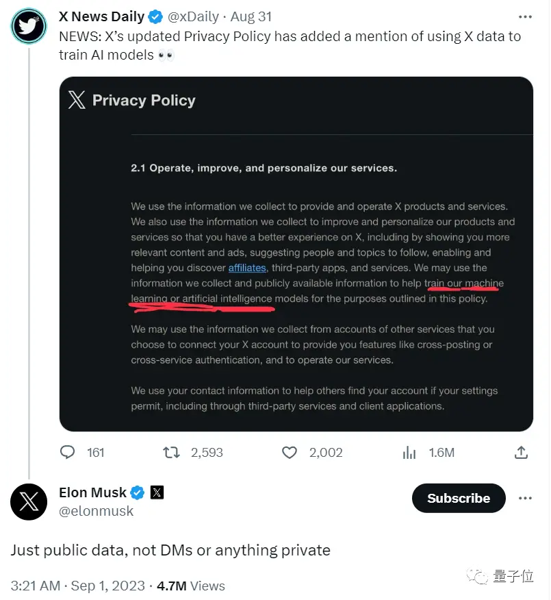 马斯克终于忍不住,开始用X的数据喂AI了!这两天,大伙儿发现X悄悄更新了一版隐私政策,里面表示会使用社交媒体数据来训练机器学习或AI模型。要知道,马斯克前不久还威胁微软,要起诉它用X的数据训练AI。