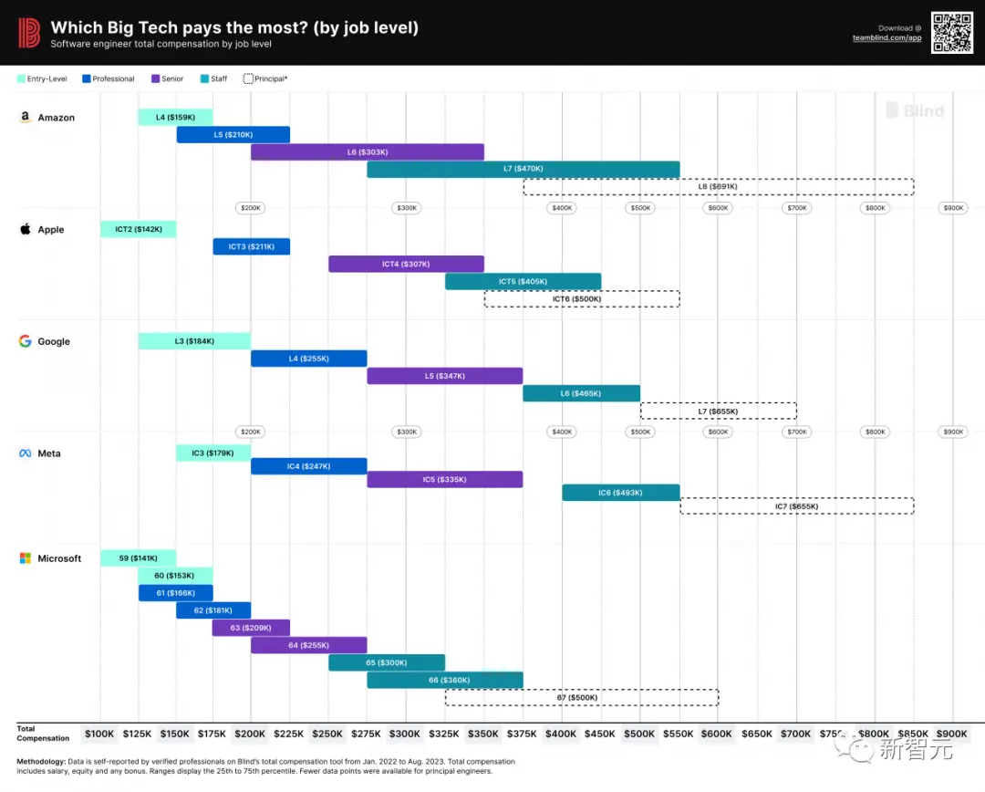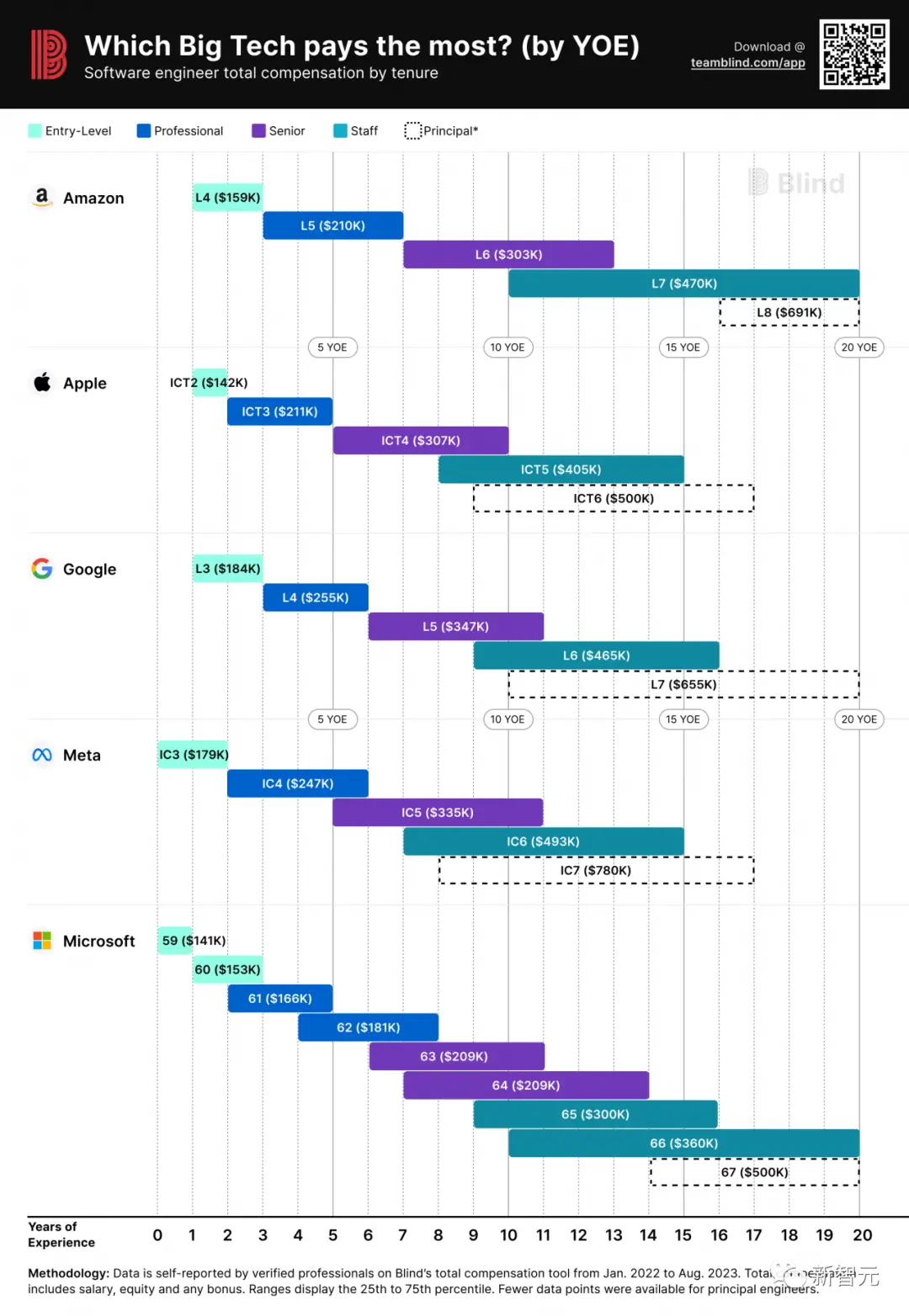 根据市场调查机构 Blind 发布的最新报告显示,亚马逊、Google和 Meta 三家公司入门级工程师支付的平均薪资,要高于苹果和微软。