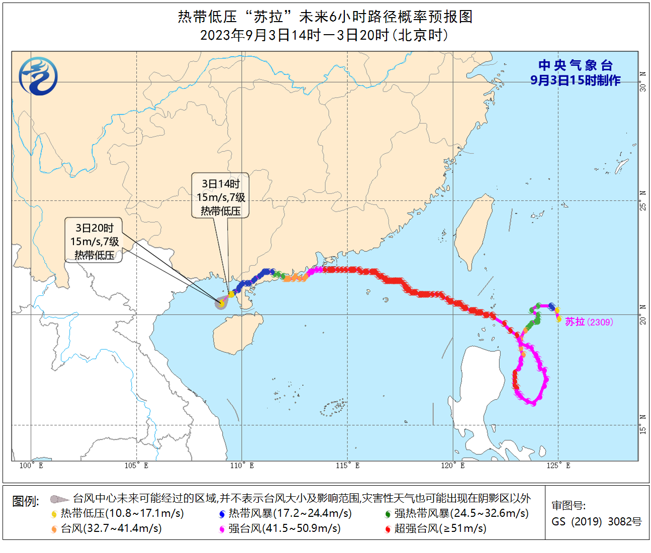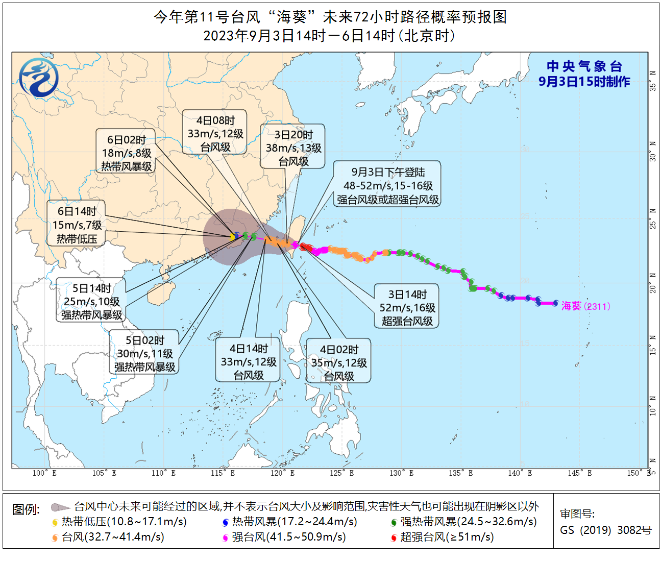 同时发布海浪橙色警报:预计9月3日夜间至4日白天,台湾以东洋面将出现6到9米的狂浪到狂涛区,东海南部、钓鱼岛附近海域、台湾海峡、南海东北部将出现4到6米的巨浪到狂浪区。