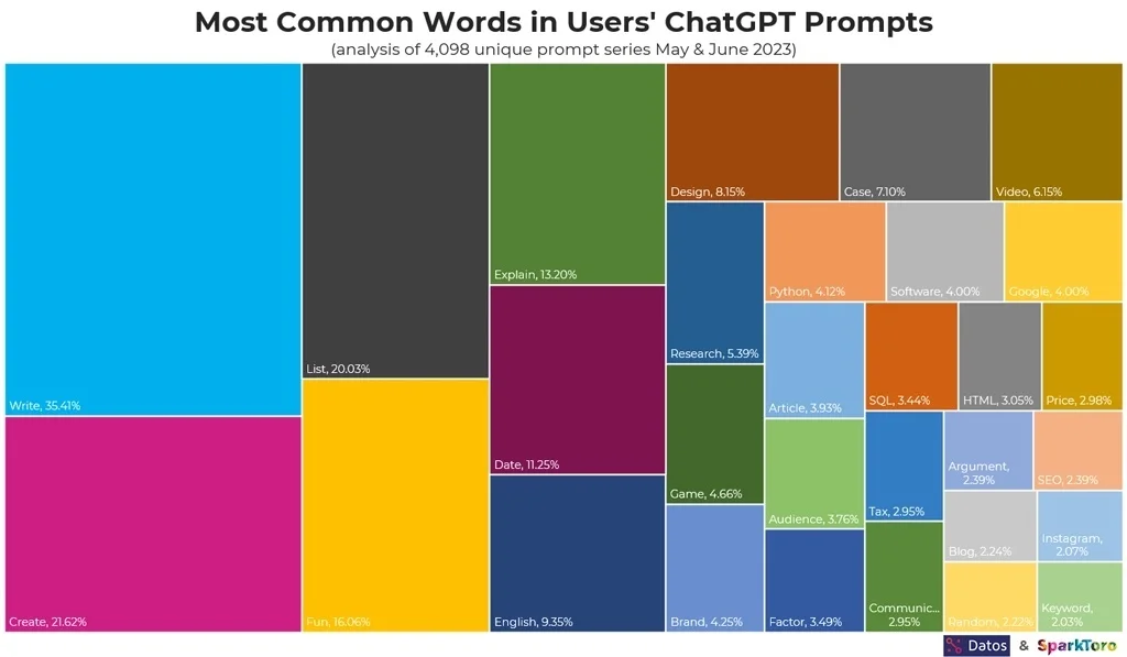 该项目还分析了 ChatGPT 请求会话中最常见的单词,“Write”、“Create”和“List”排在前三位。