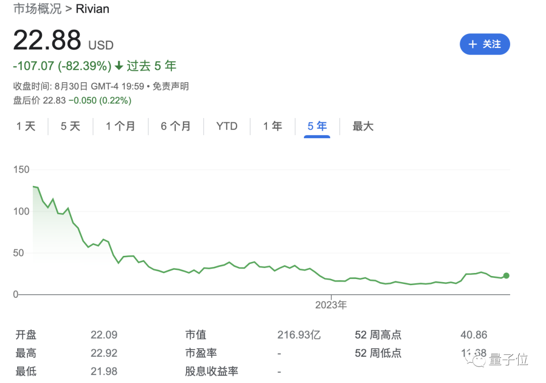 但好景不长,到2022年,Rivian一共蒸发了超过90%,只剩下可怜的200多亿。