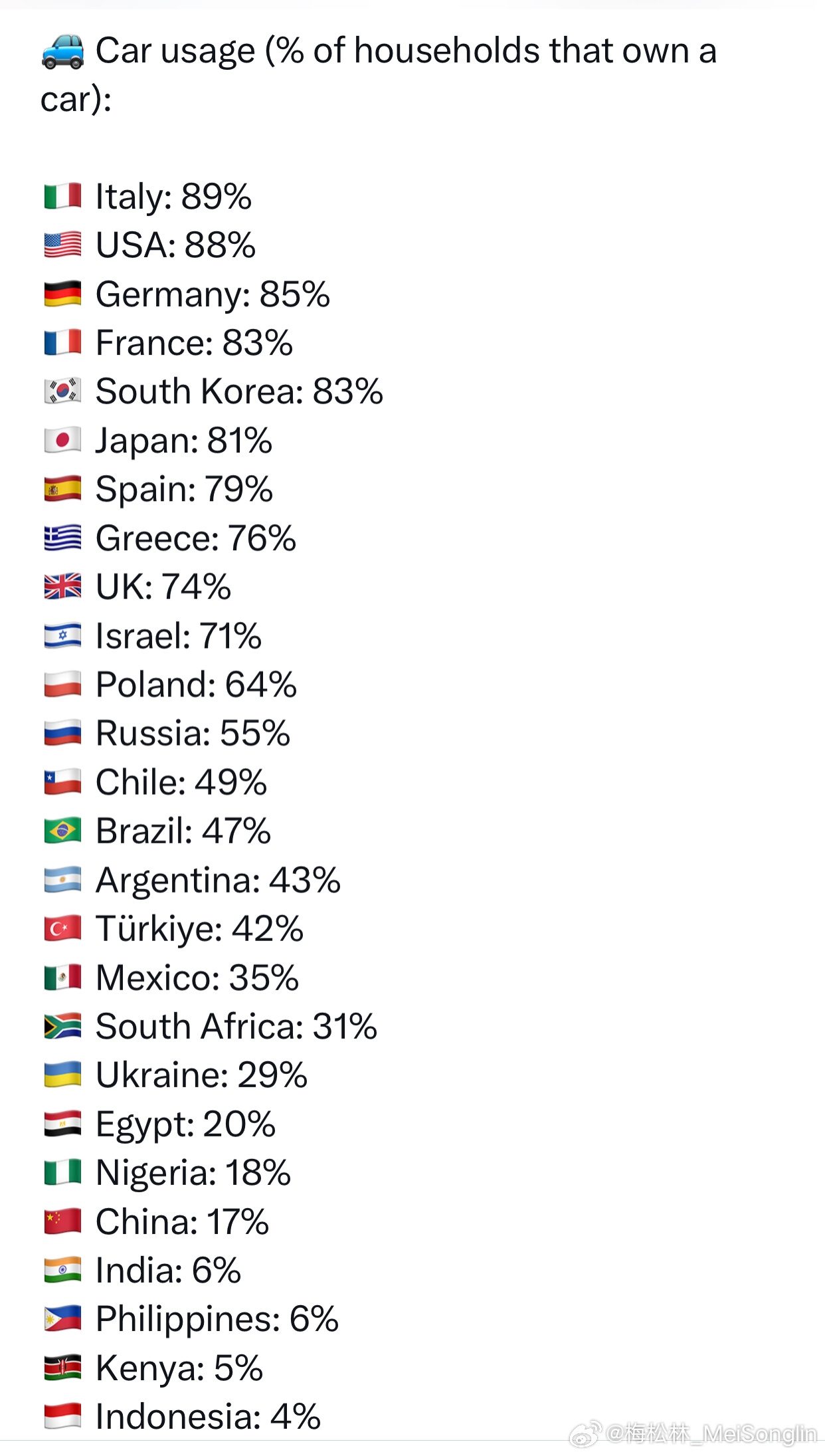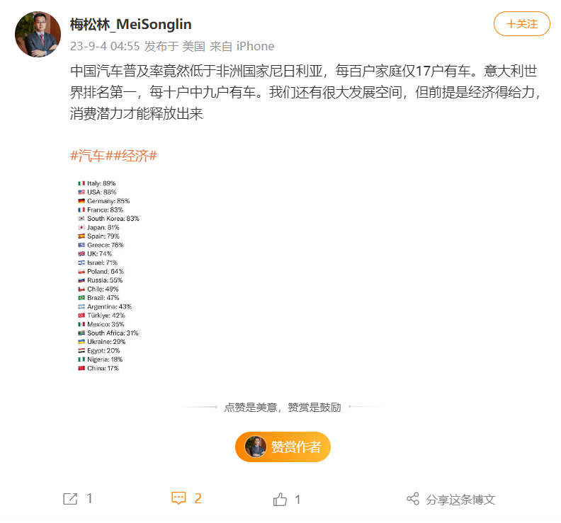 日前,威马汽车首席数据官梅松林转发了一份“世界各国地区拥车率排行榜”,同时,他发文表示:中国汽车普及率竟然低于非洲国家尼日利亚,每百户家庭仅17户有车。意大利世界排名第一,每十户中九户有车,我们还有很大发展空间。