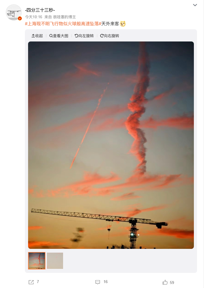近日上海晚霞中的不明飞行物引起网友关注。据网友晒出的拍摄视频显示,天空中出现速度飞快的不明物,似火球般高速坠落,还带有长长的拖尾。对此,中国气象局公共气象服务中心在官方微博发文,认为像是“飞机的尾迹云”;上海市气象局也推测,可能是尾迹云扩散后形成的。