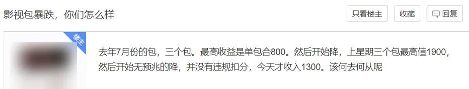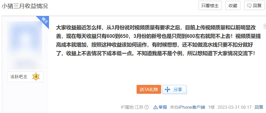 而小猪优版吧今年 2 月份就有一个叫《 影视包暴跌,你们怎么样 》的帖子,多位吧友们在聊收益暴跌的事儿,有单个视频收益从 80 跌到 43 的,也有跌到 50 、 60 的。