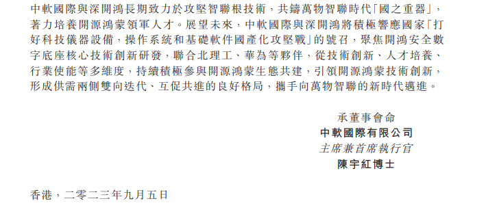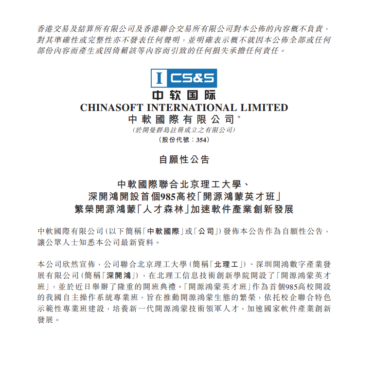 据中软国际介绍,日前,中软国际有限公司(“中软国际”)联合北京理工大学(“北理工”)、深圳开鸿数字产业发展有限公司(“深开鸿”),在北理工信息技术创新学院开设了首个“开源鸿蒙英才班”。