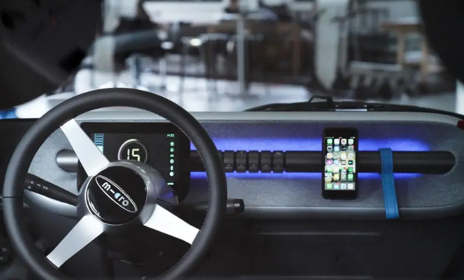 进入车内,这款小车拥有着十分简洁的内饰,除了方向盘与仪表盘之外,只有一根自带发光的棍子,方面放置手机、音响等物品。