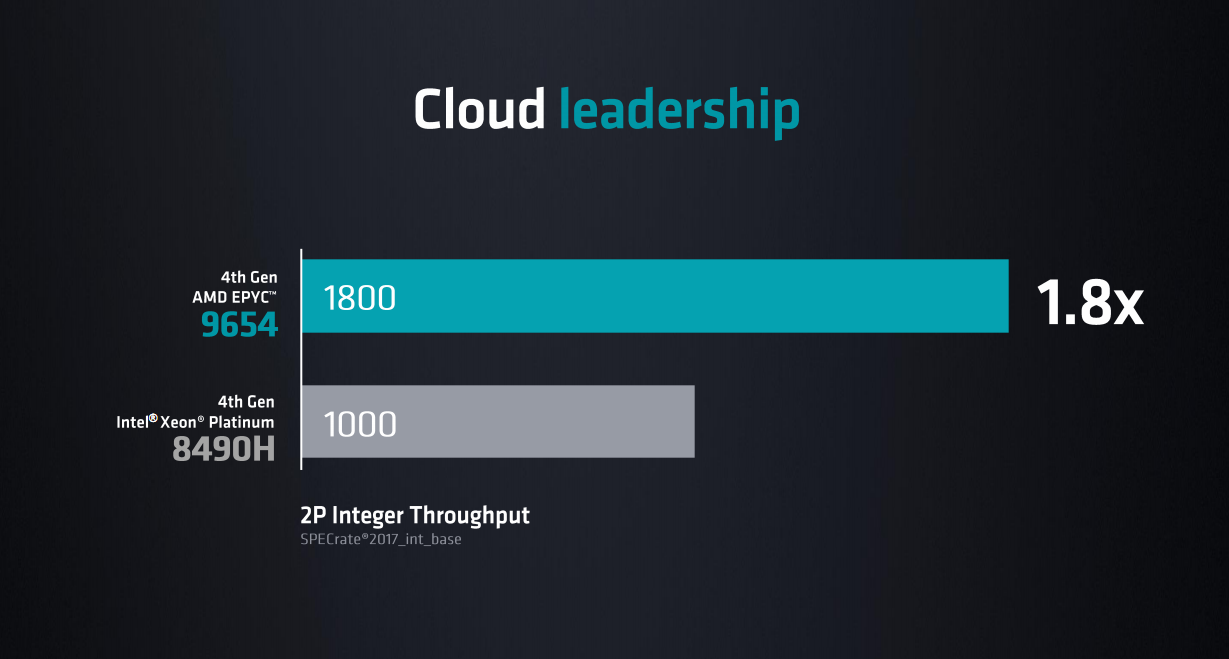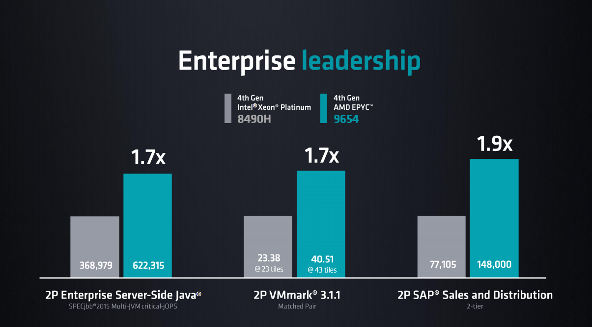 根据官方数据,96核心的旗舰Genoa EPYC 9654对比60核心的竞品旗舰至强铂金8490H,无论是SPECrate2017_int为代表的云服务应用中,还是Java、VMmark、SAP等企业级应用中,性能差异都达到了1.8倍左右,可以说直接甩开了一个身位,根本不给追赶的空间。