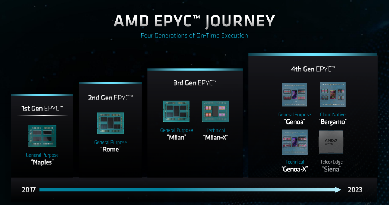 最新的第四代Genoa EPYC 9004系列,更是多点开花,从通用计算到高密度计算,从云服务到边缘计算,再到AI,几乎无所不能。