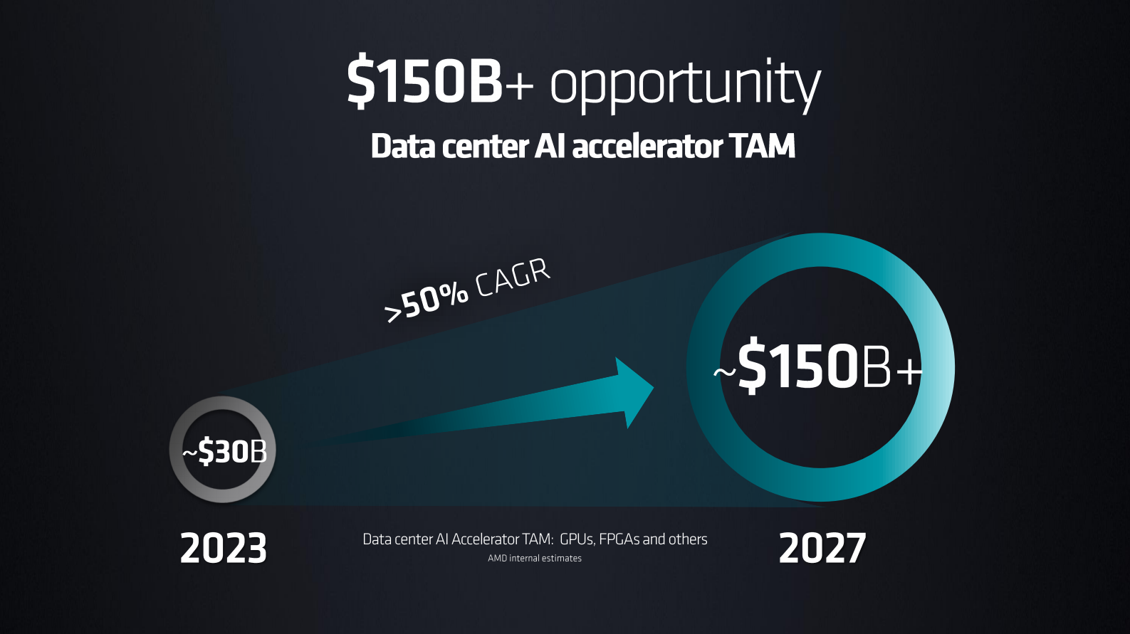 今年6月份的“数据中心与人工智能技术首映会”上,AMD给出的数据显示,仅仅是在数据中心, AI加速器的市场价值在2023年就有约300亿美元,预计到2027年可超过1500亿美元,年复合增长率超过50%,妥妥的蓝海。
