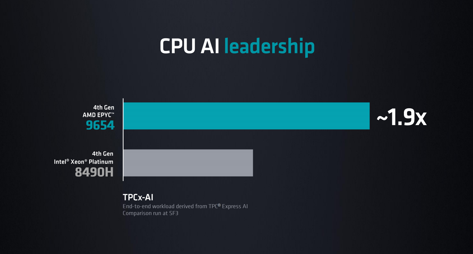 随便举个例子,TPCx-AI端到端负载计算中,EPYC 9654相比于至强铂金8490H的性能优势轻松达到了大约1.9倍之多。