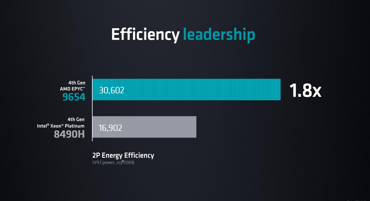 更关键的是,性能非常高的同时,EPYC的能效也非常高,性能优势也达到1.8倍左右。