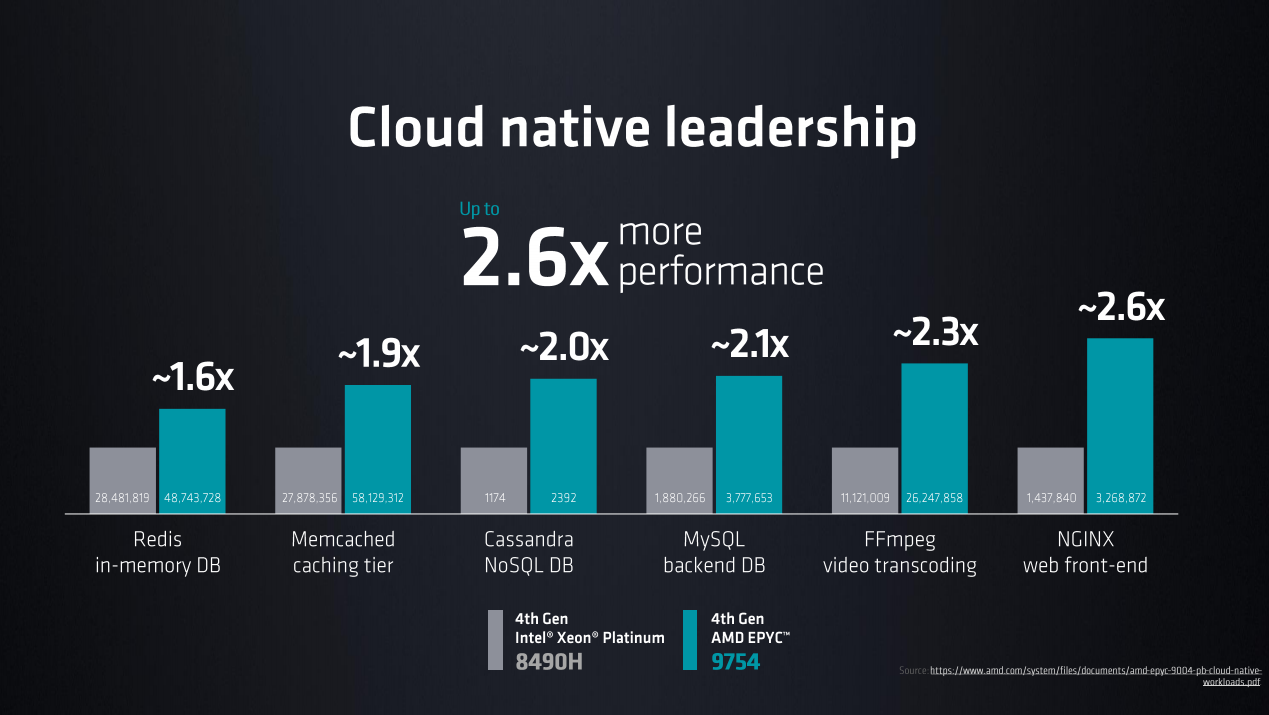 128核心的Bergamo EPYC 9754在云原生应用中,更是近乎蹂躏至强铂金8490H,性能优势更是最高达到惊人的2.6倍。