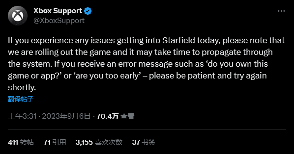 许多玩家在预载《星空》后等到了游戏正式发布时间后打开游戏,却看到了“你来太早了”的错误消息。对此,在推特上 Xbox 客服账号发布推文说道:“如果您今天在进入《星空》时遇到任何问题,请注意,我们正在推出该游戏,可能需要一些时间才能传至整个系统。如果您受到错误消息,例如‘您拥有这个游戏或应用程序吗?’,或是‘您是不是太早了’——轻耐心等待,稍后再试。”