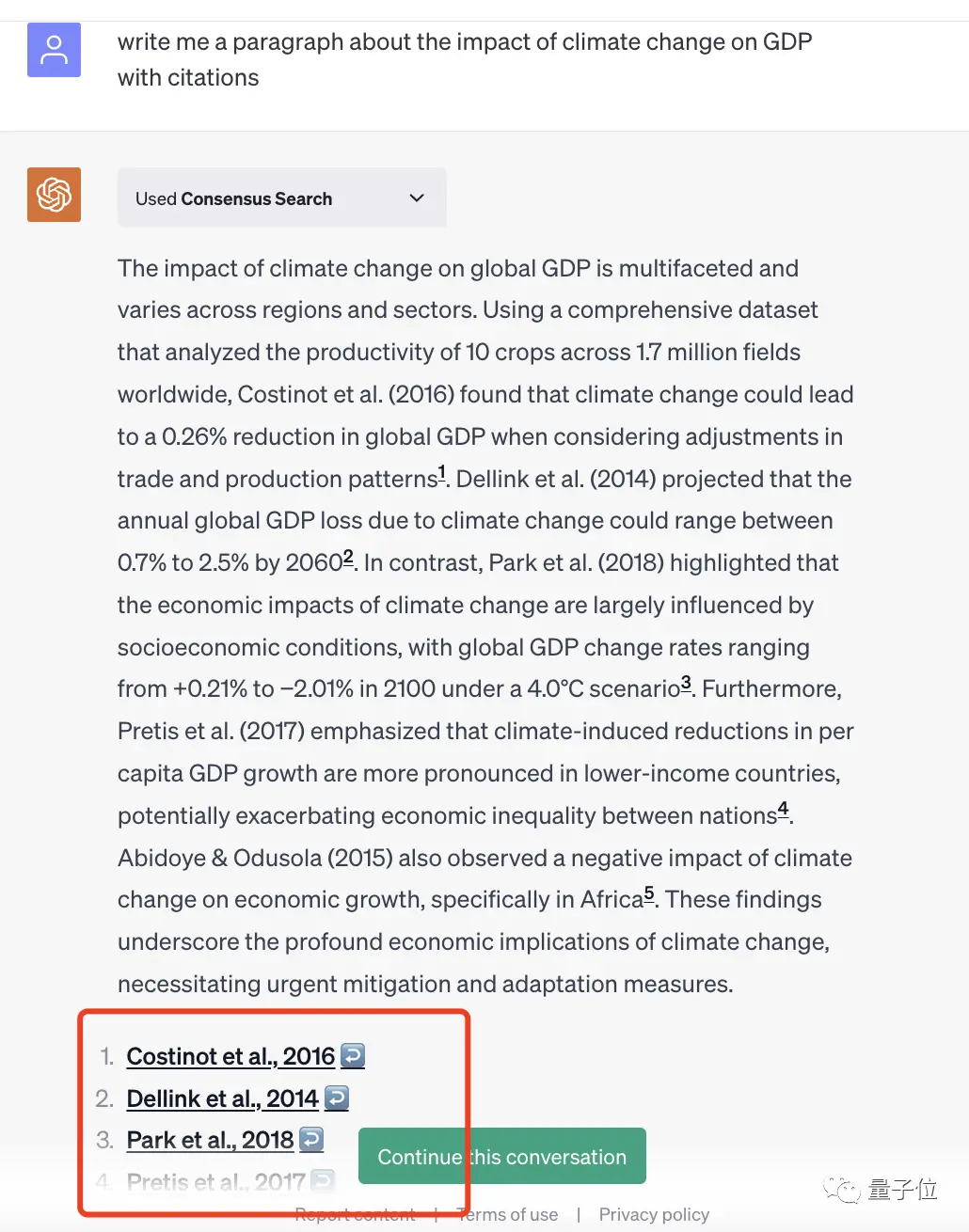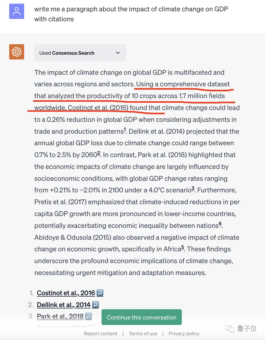 比如:“给我写一段关于气候变化对GDP影响的论述,并附上引文。”