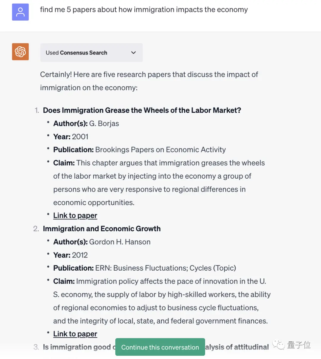 比如:“给我找5篇关于移民如何影响经济的论文”,插件给出的答案就是这样的: