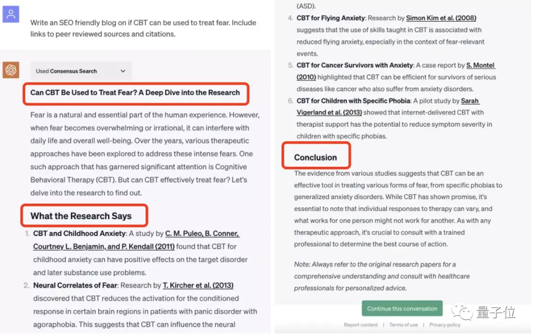 提示词如“写一篇SEO友好的博客,讨论CBT(认知行为疗法)是否可以治疗恐惧,包含经同行评审的论文链接”。
