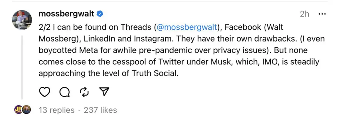 美国知名科技记者、专栏作家莫博士(Walt Mossberg)周三宣布退出Twitter(已更名为X),转投扎克伯格旗下社交网络Threads。他在Threads上炮轰Twitter老板马斯克,认为马斯克把Twitter变成了一个“粪坑”(cesspool),里面充满了偏执狂、骗子和亲叛乱分子的人。