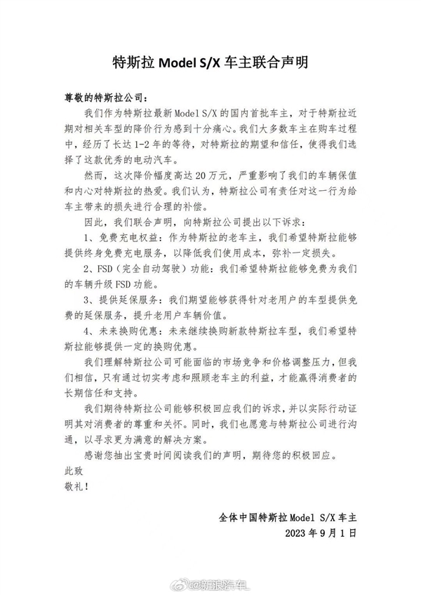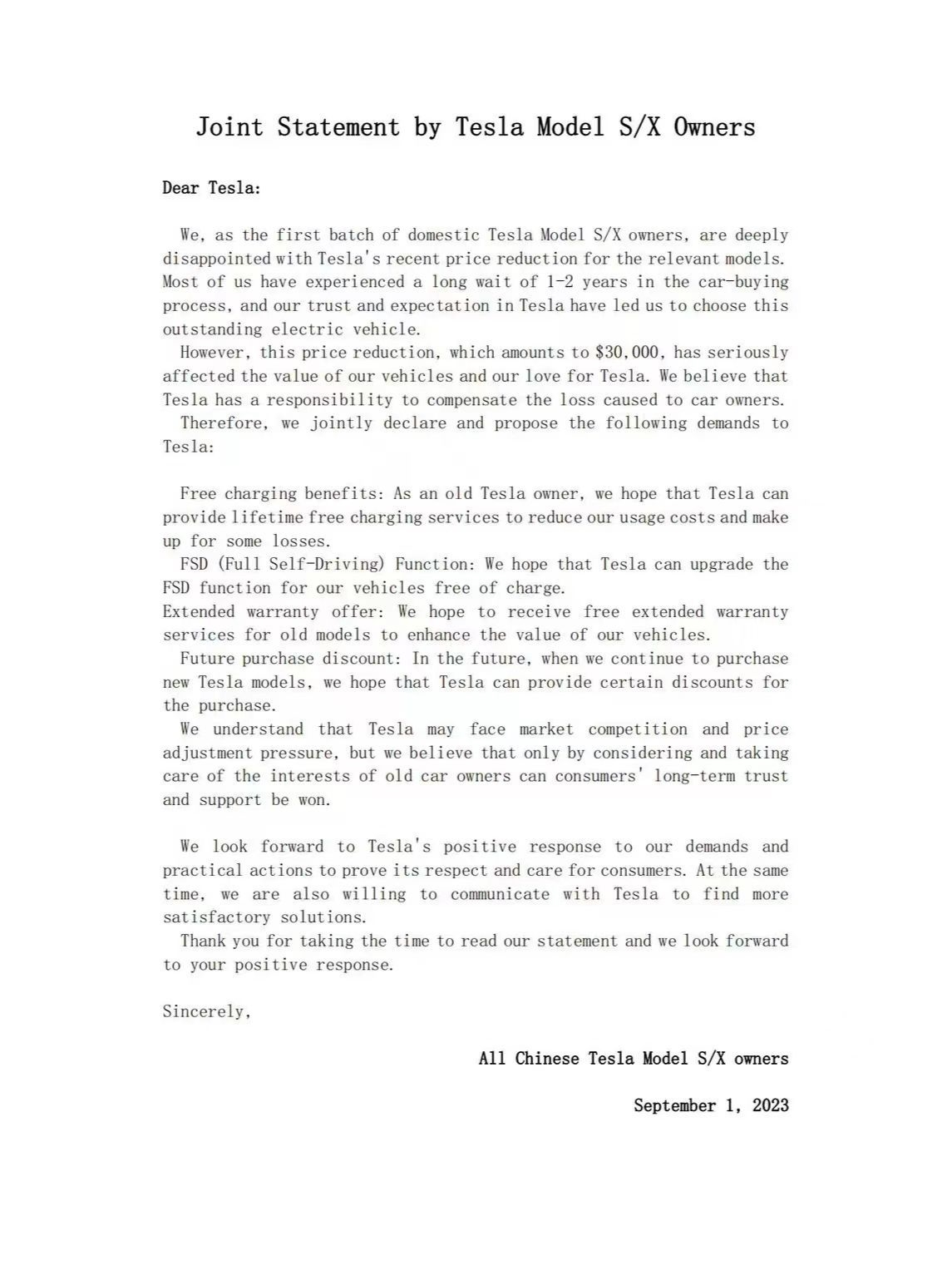 在网上流传的联合声明里,特斯拉Model S和X的部分车主提出了四点诉求: