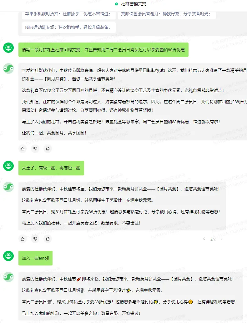 我们测试了一下社群营销文案,刚好最近中秋节要到了,看到一些社群在发月饼团购文案,就让混元也试了一下。