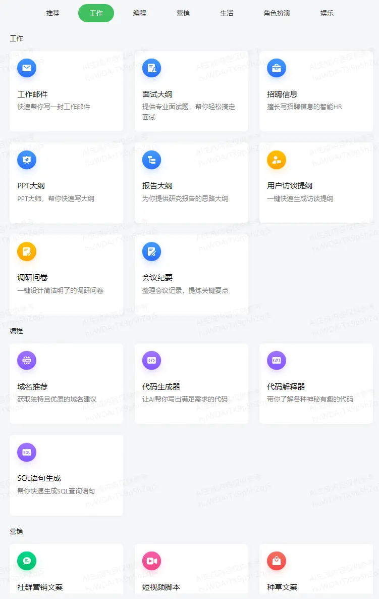 除了常规的对话,混元还给出了比较丰富的 “ 特调 ” 应用,叫作 “ 灵感发现 ”,囊括了各个场景下的诸多功能: