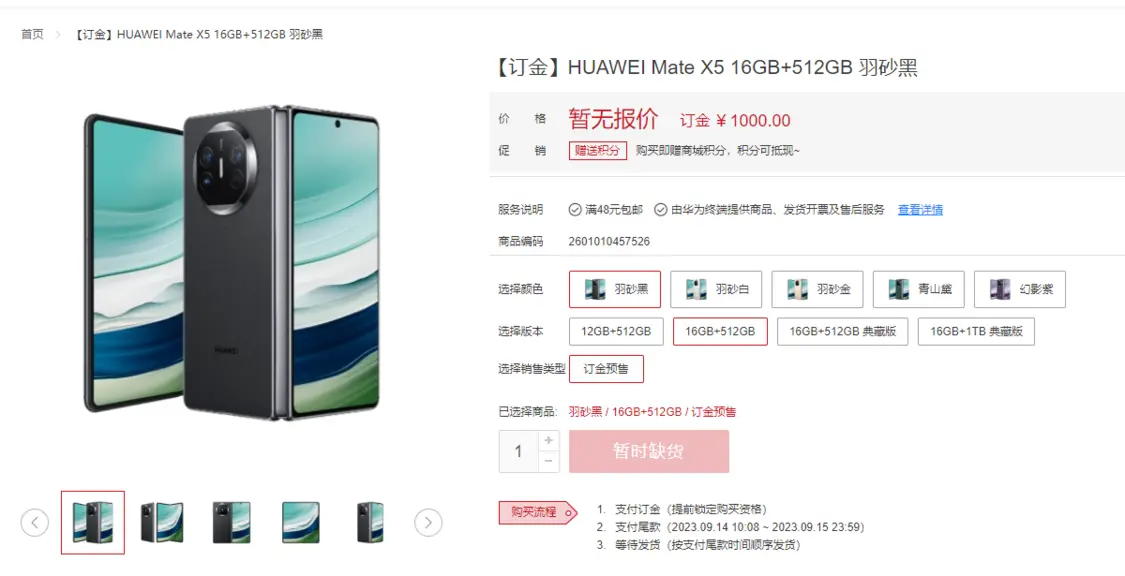 9月8日,华为推出折叠屏机型Mate X5和Mate X5典藏版,Mate X5系列还是供不应求,不到十秒官网显示“暂时缺货”。据了解,这将是华为史上最强悍的折叠屏机型。目前来看,官网并未透露其价格,该机拥有四个版本,分别为12GB+512GB、16GB+512GB、16GB+512GB典藏版、16GB+1TB典藏版。