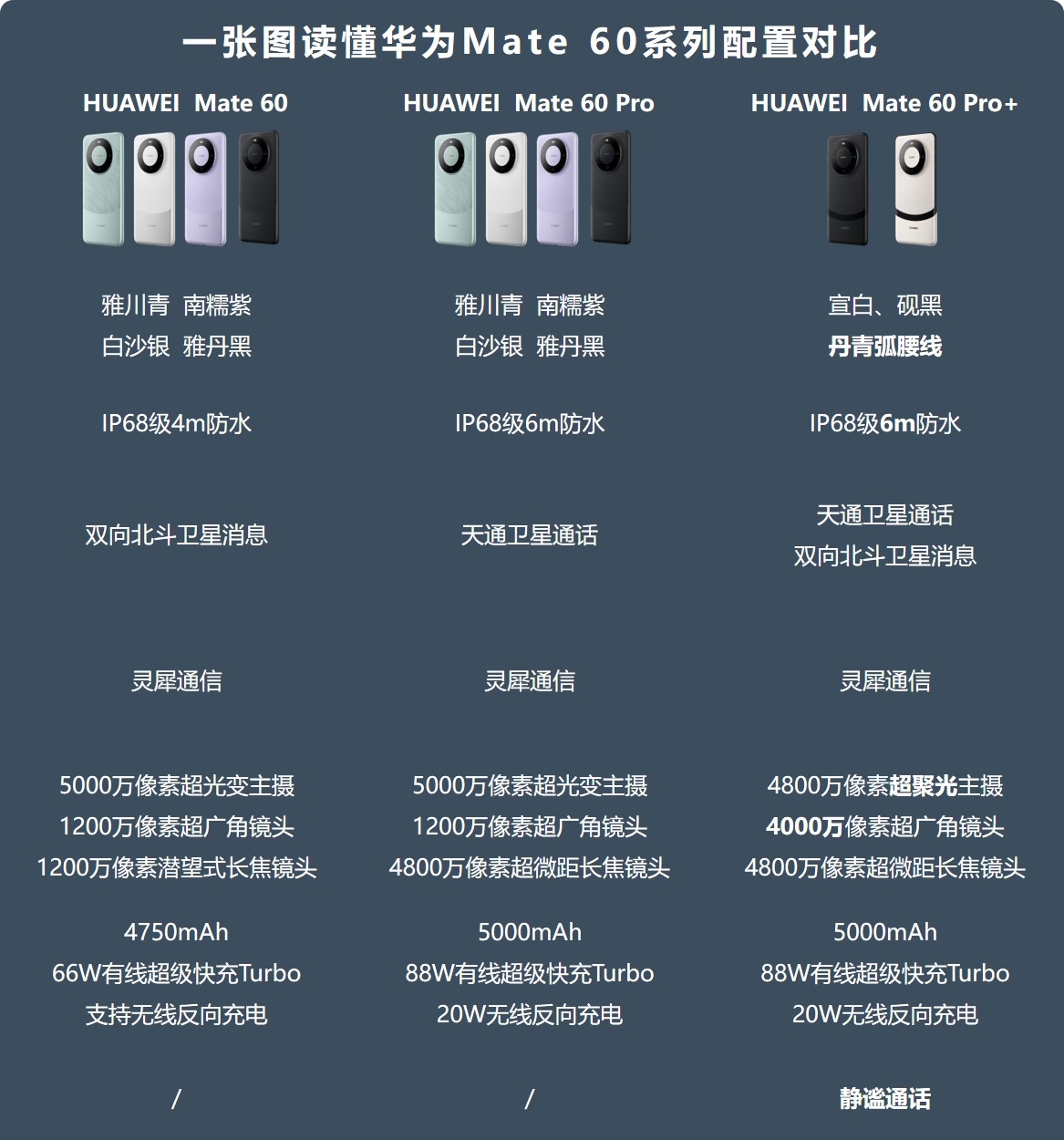 华为Mate 60 Pro+开售 和Mate 60/60 Pro有啥区别?一图对比