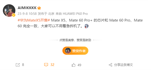 Mate X5、Mate 60 Pro+的芯片和Mate 60 Pro、Mate 60完全一致,大家可以不用着急拆机了。