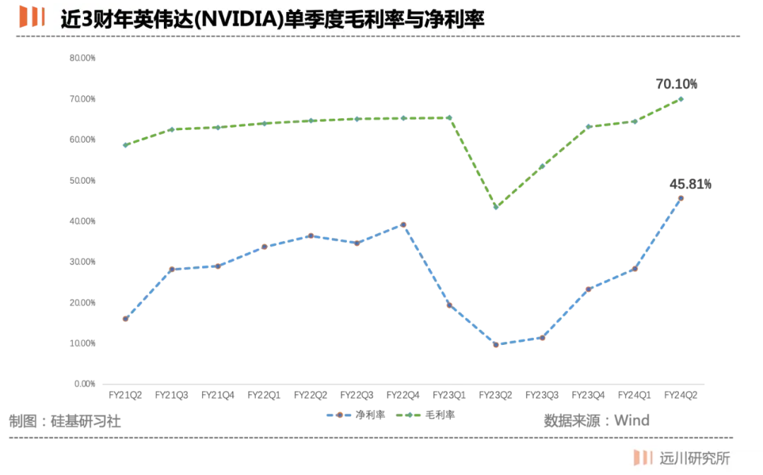 在本轮AI热潮之前,英伟达的毛利率常年维持在65%上下,而净利率通常只有30%。而今年Q2受高毛利的A100/A800/H100的拉动,毛利率站上70%,净利率更是高达45.81%。