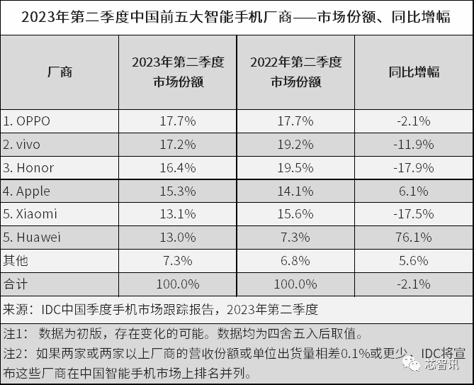 根据IDC公布的2023年二季度中国智能手机市场报告显示,前六大厂商分别为OPPOvivo荣耀、苹果、小米和华为。
