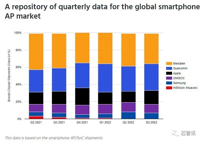 根据Counterpoint Research的数据来看,2022年三季度全球智能手机AP市场报告,从出货量来看,联发科仍位居第一,市场份额为35%。