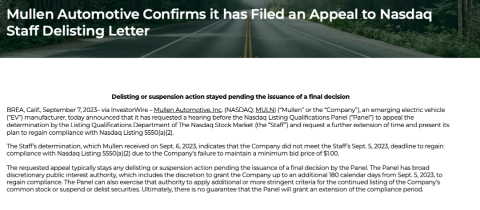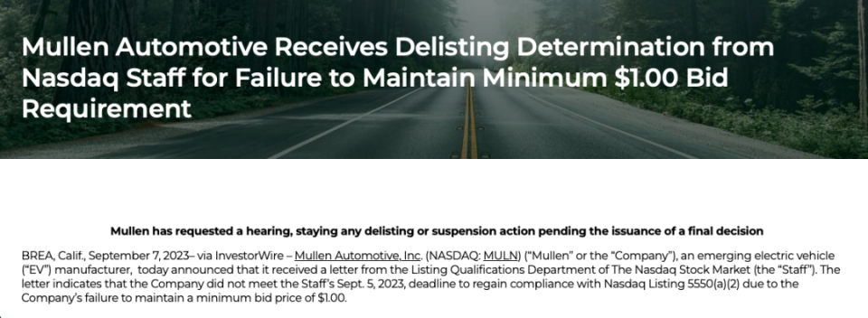 9月7日,Mullen发布公告,称收到了纳斯达克上市资格审查部门的退市通知。通知信中表示,由于股票没能保持 1美元的最低买入价,也没有在规定的最后期限前(2023 年9月5日)重新达到纳斯达克上市的要求。