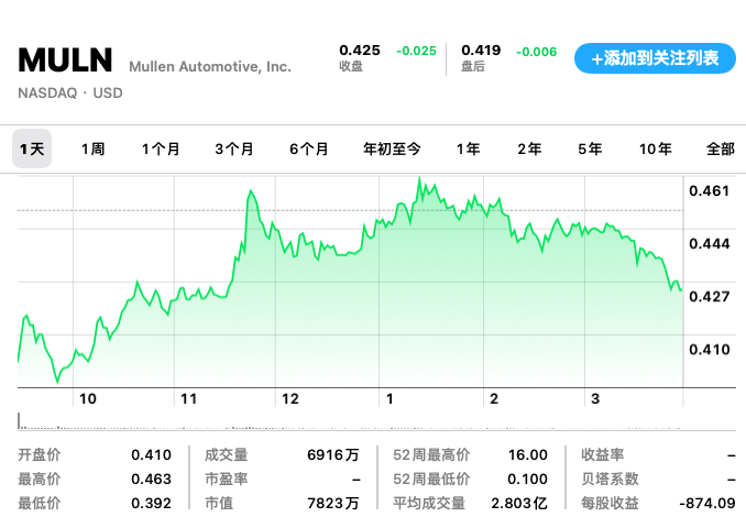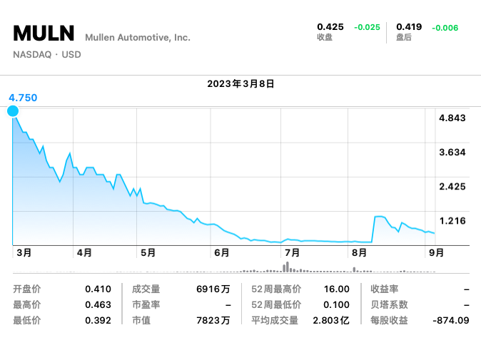 截至昨日收盘,Mullen的每股报价已跌至0.425美元,市值仅有7823万美元。