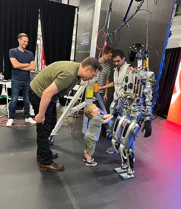 马斯克和儿子X看着机器人Optimus。图片来源:沃尔特·艾萨克森
